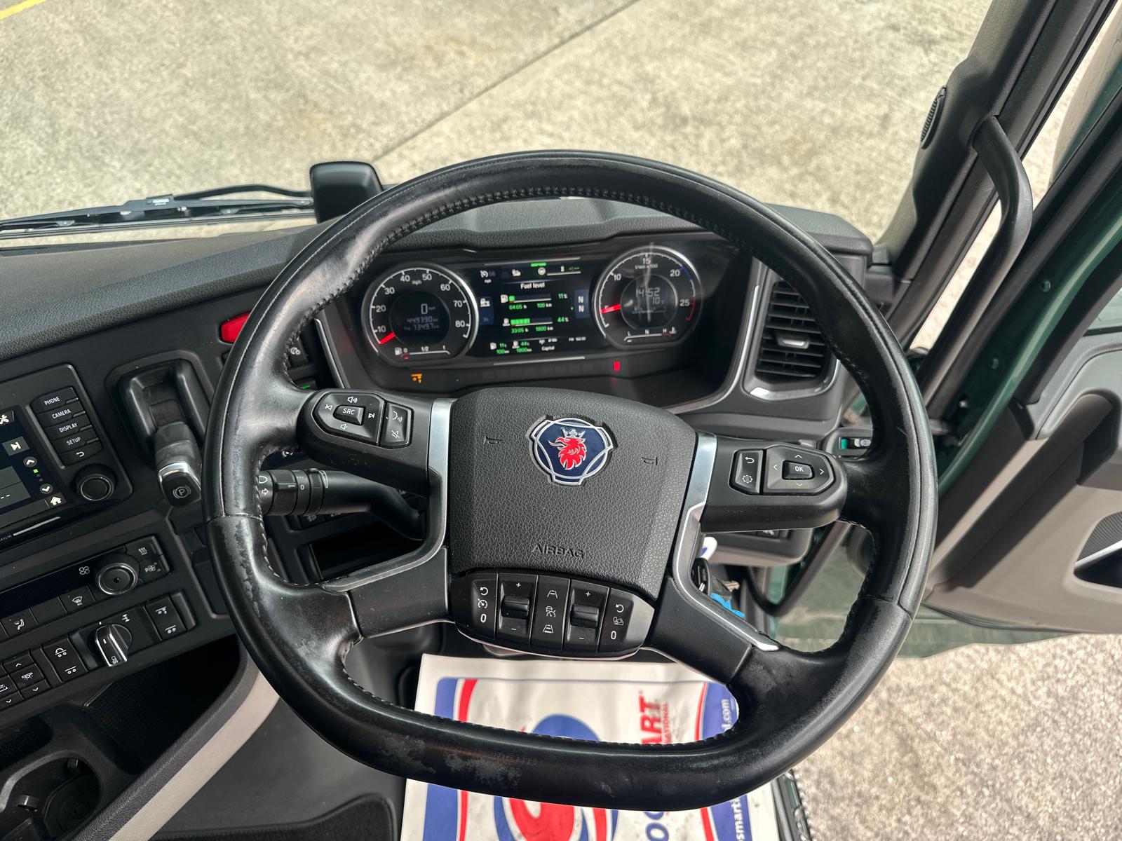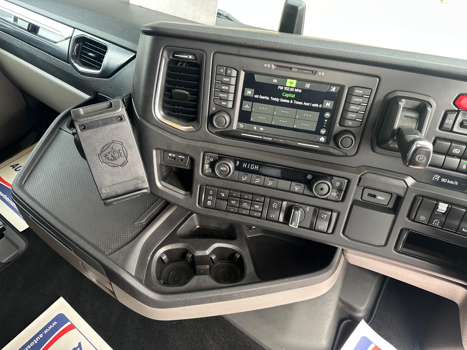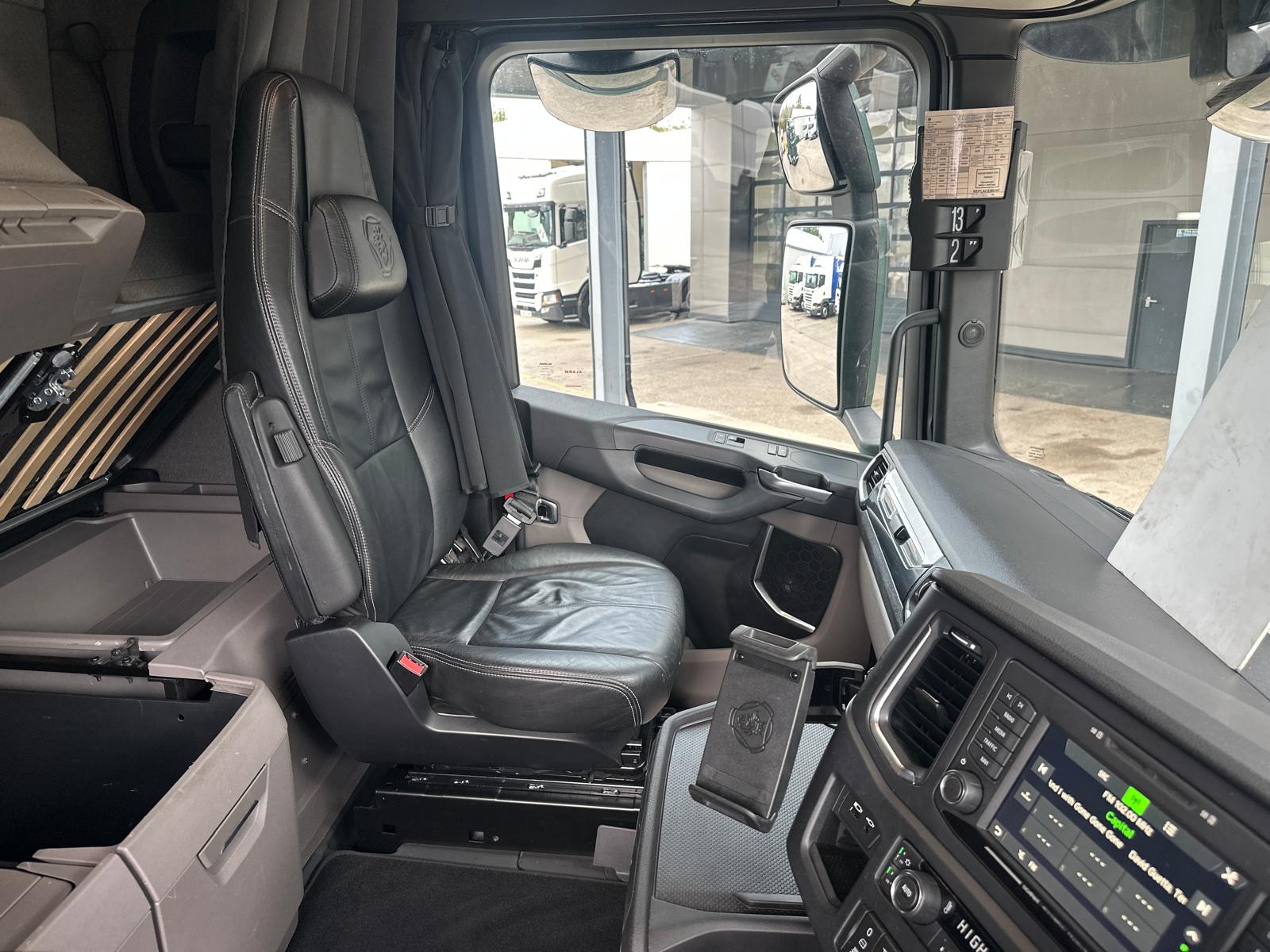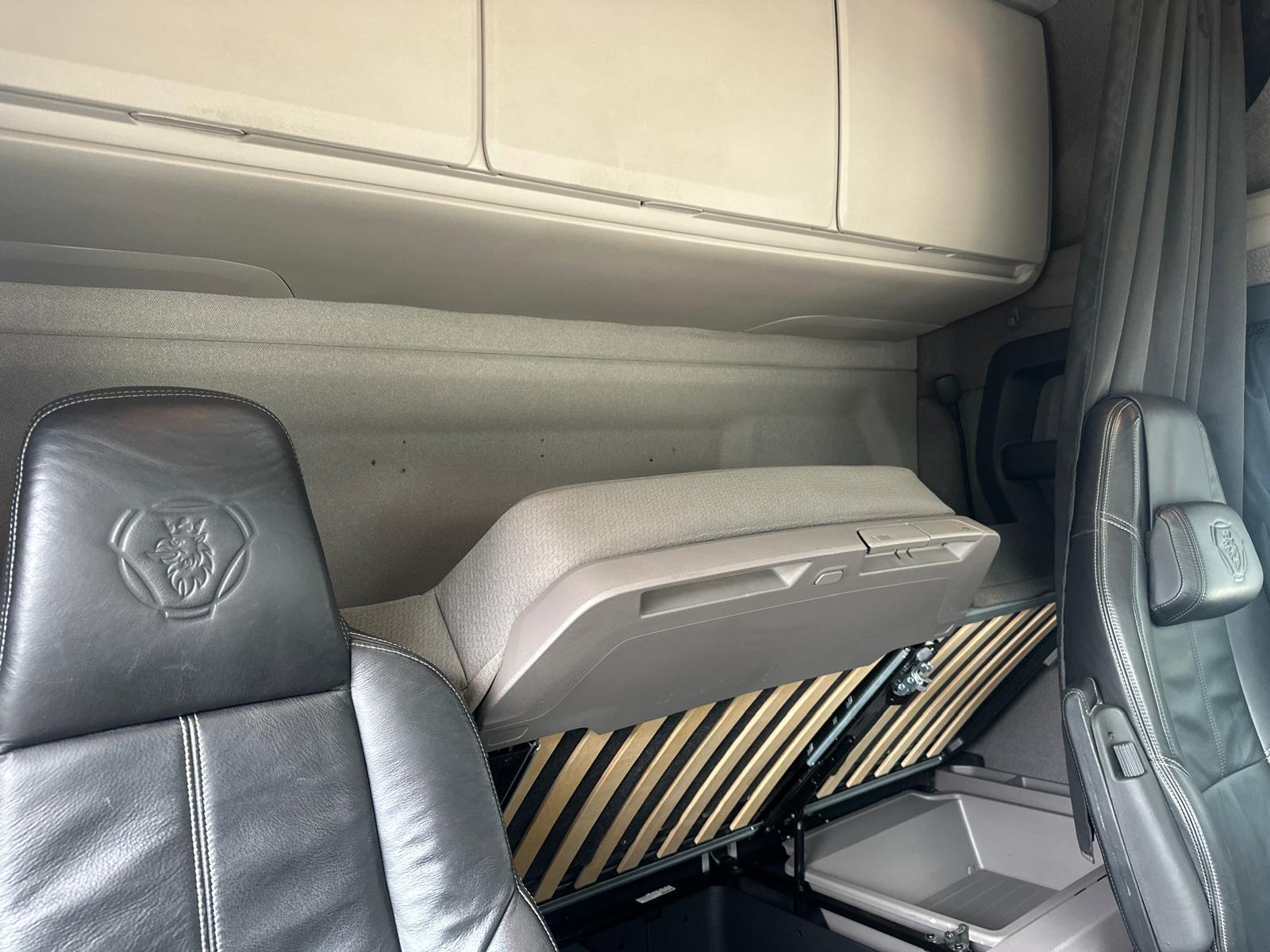 Leather Interior, Scania Premium Infotainment System, Fridge, Side skirts, Sky lights and fog lights, Single Bunk with Rear Lockers, Illuminated Headboard, Airhorns, Colour Coded, Power Blower
