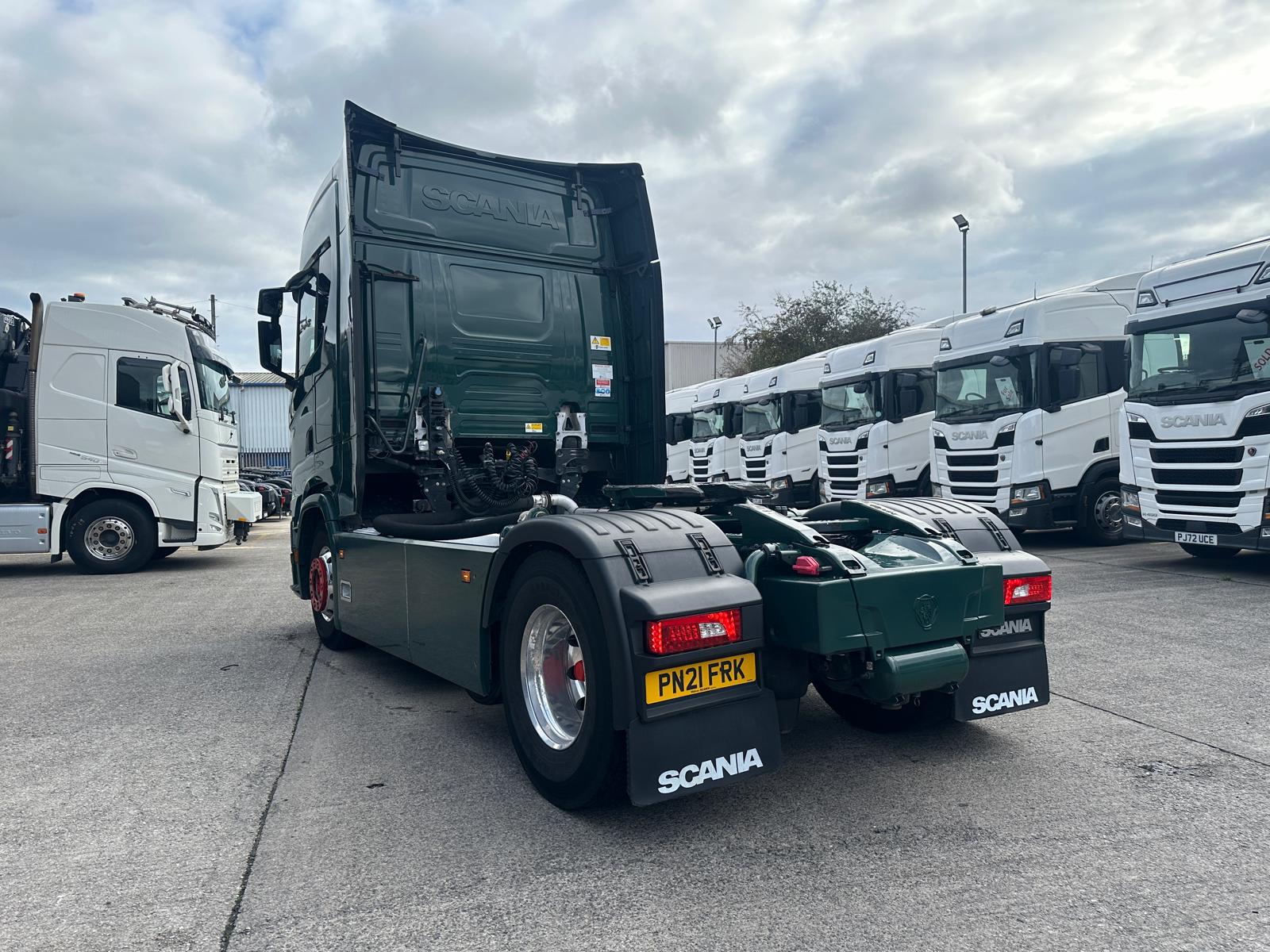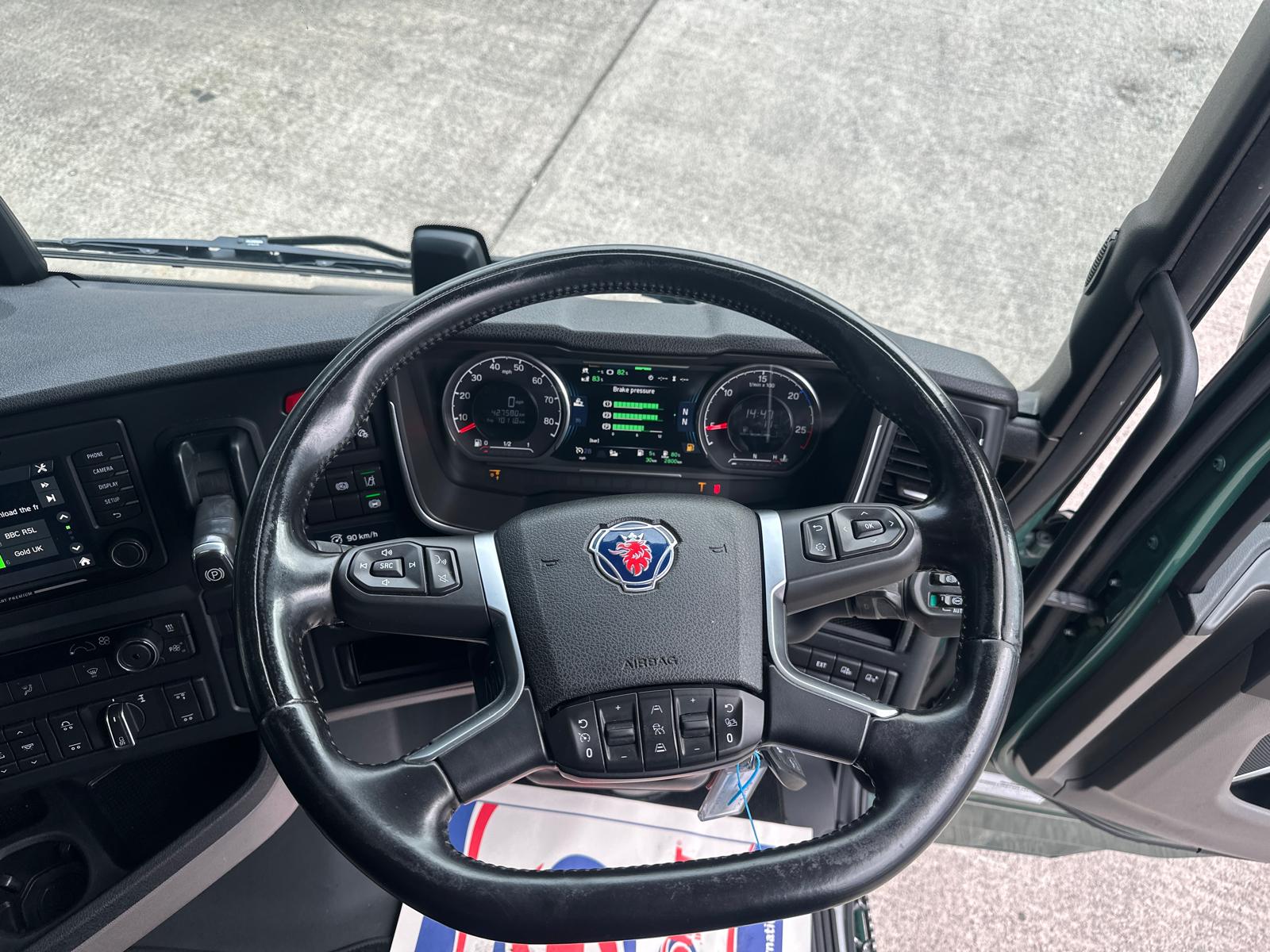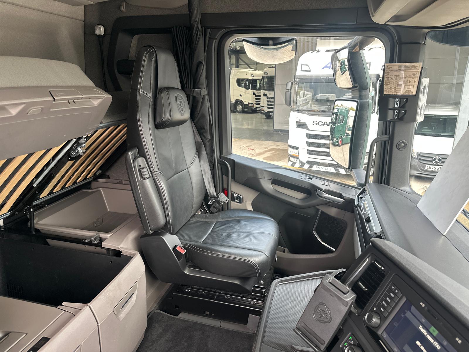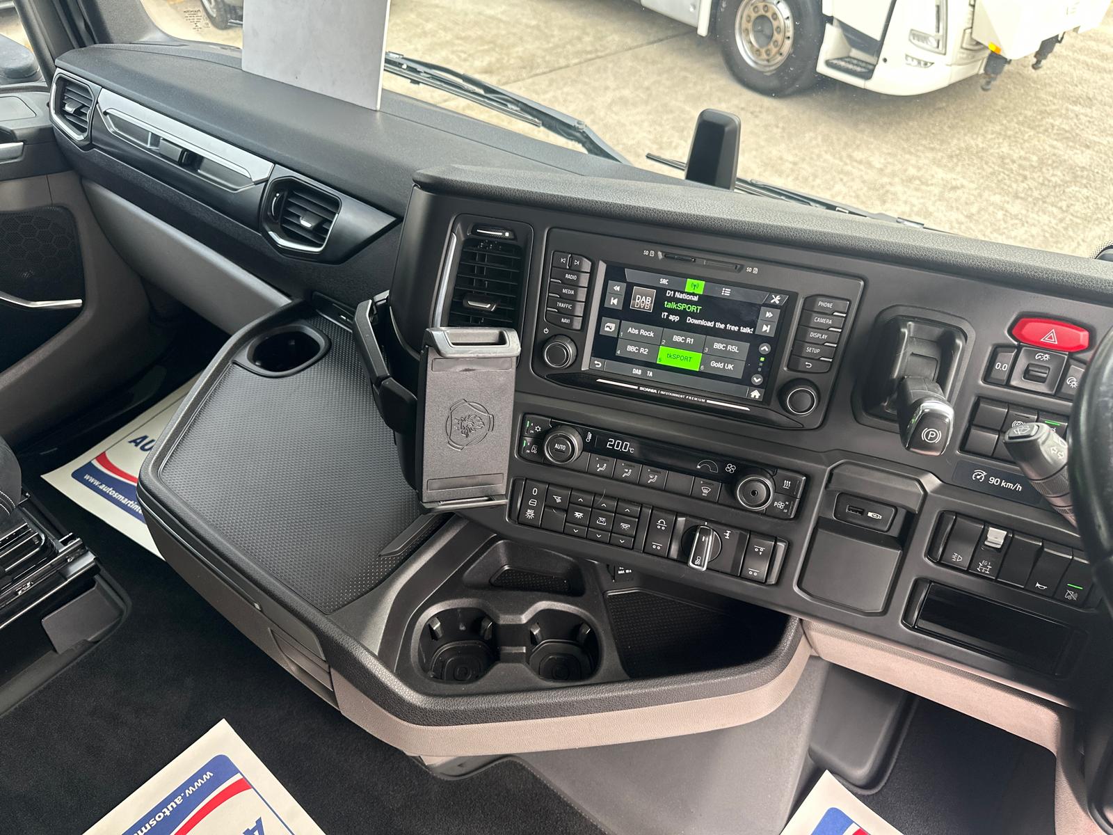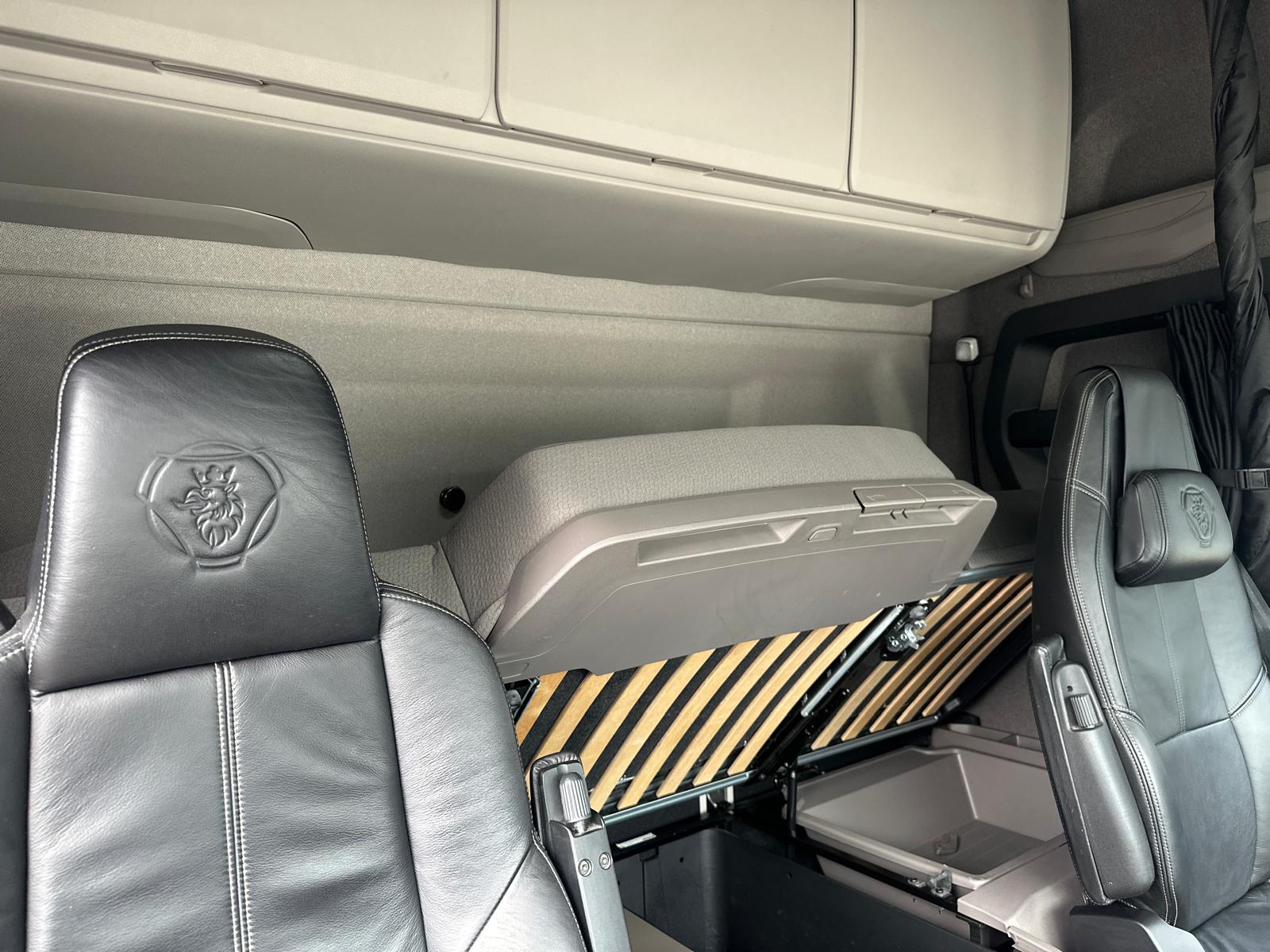 Leather Interior, Scania Premium Infotainment System, Fridge, Side skirts, Sky lights and fog lights, Single Bunk with Rear Lockers, Illuminated Headboard, Airhorns, Colour Coded, Power Blower