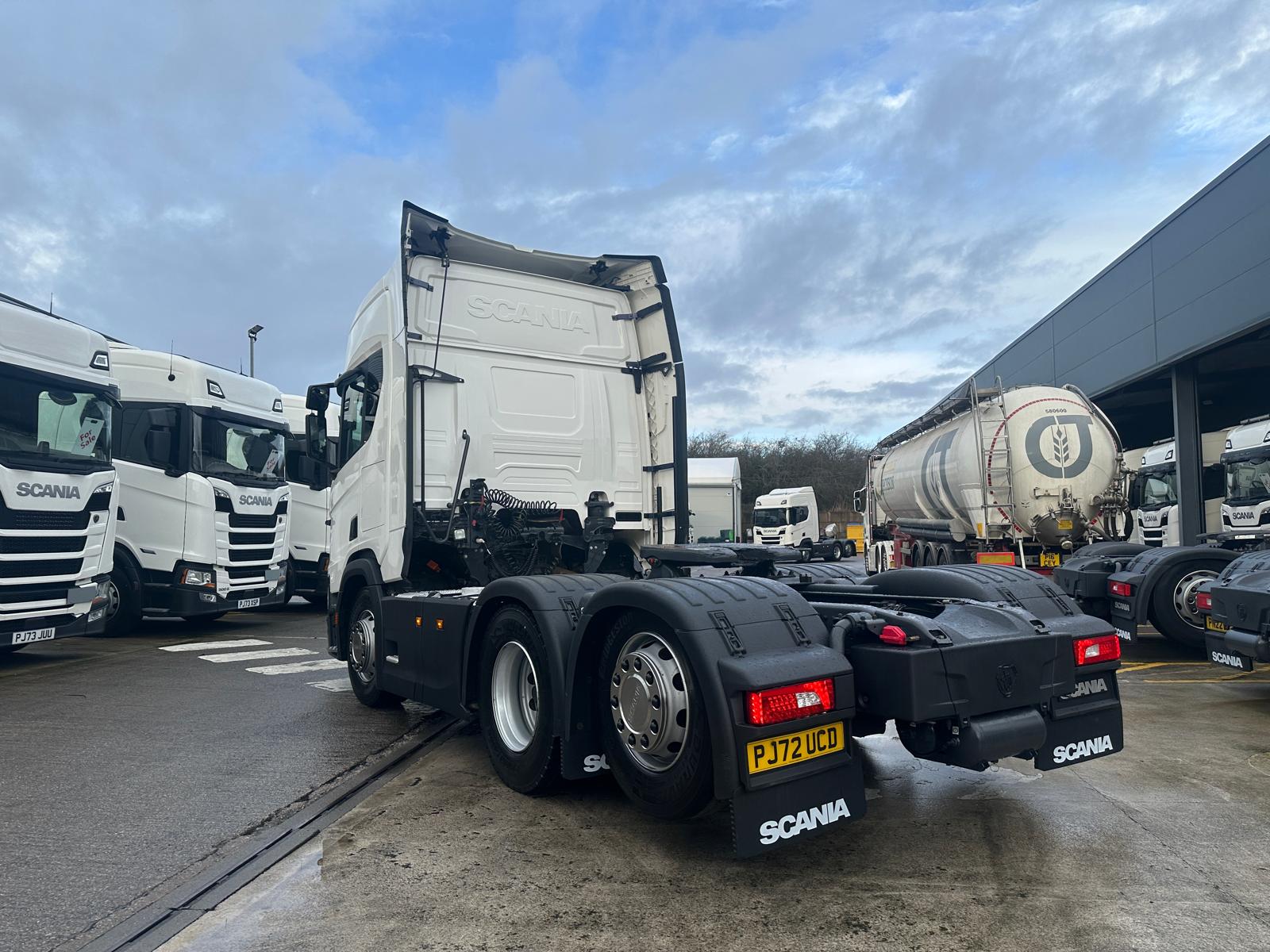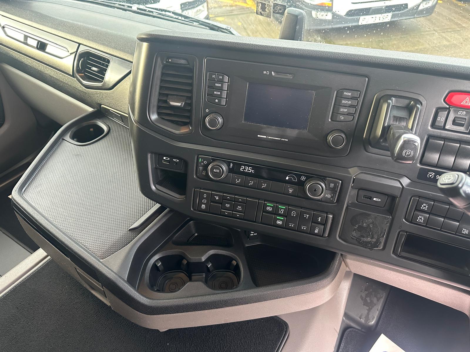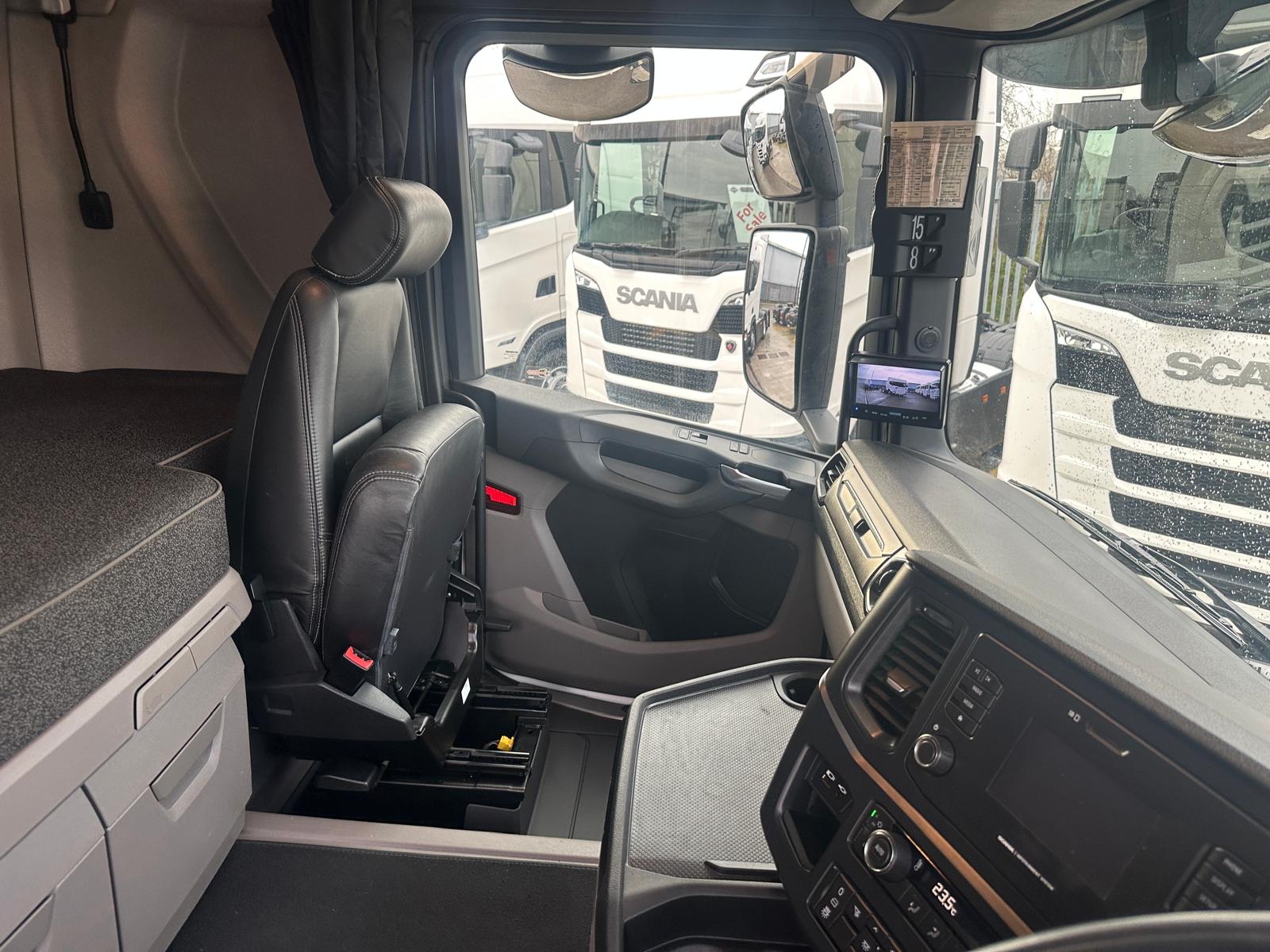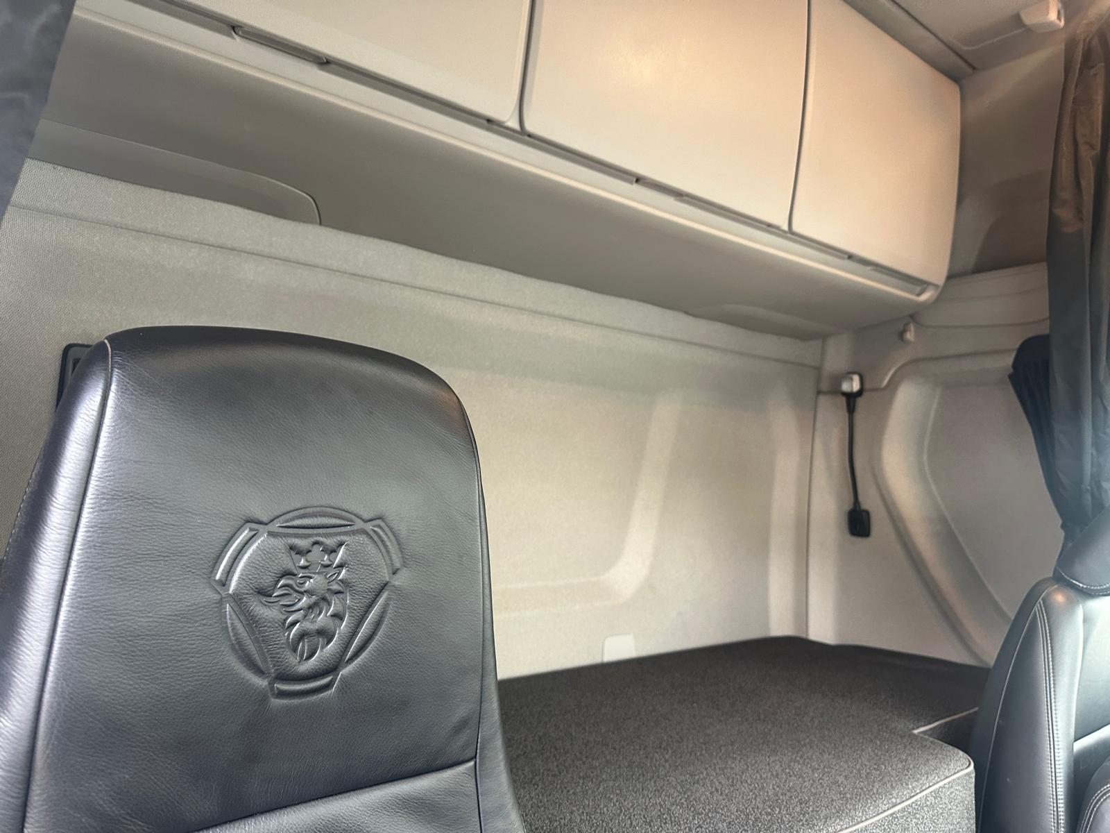Leather Interior, Scania Premium Infotainment System, Fridge, Side skirts, Sky lights and fog lights, Single Bunk with Rear Lockers, Illuminated Headboard, Airhorns, Colour Coded, Powder Blower