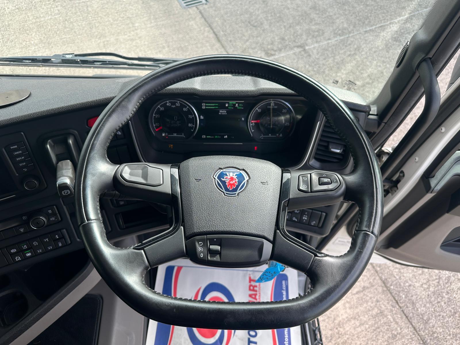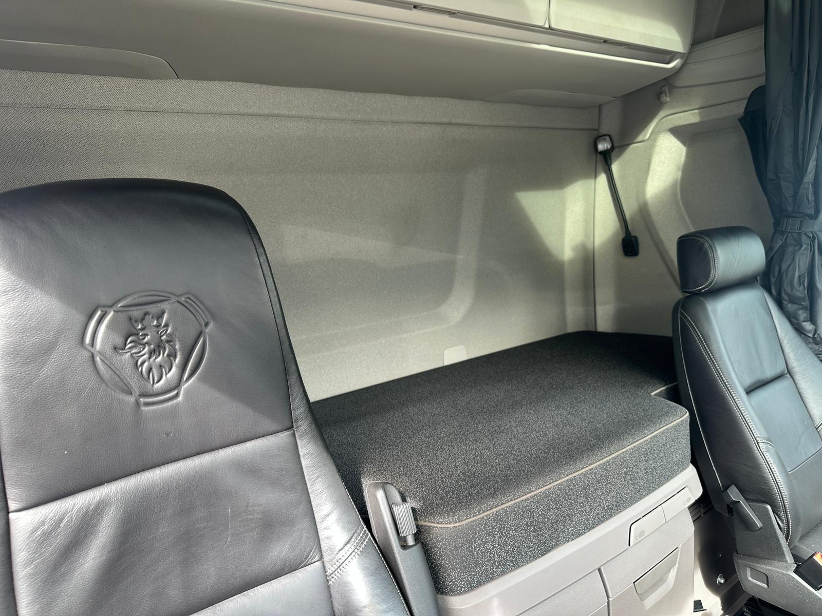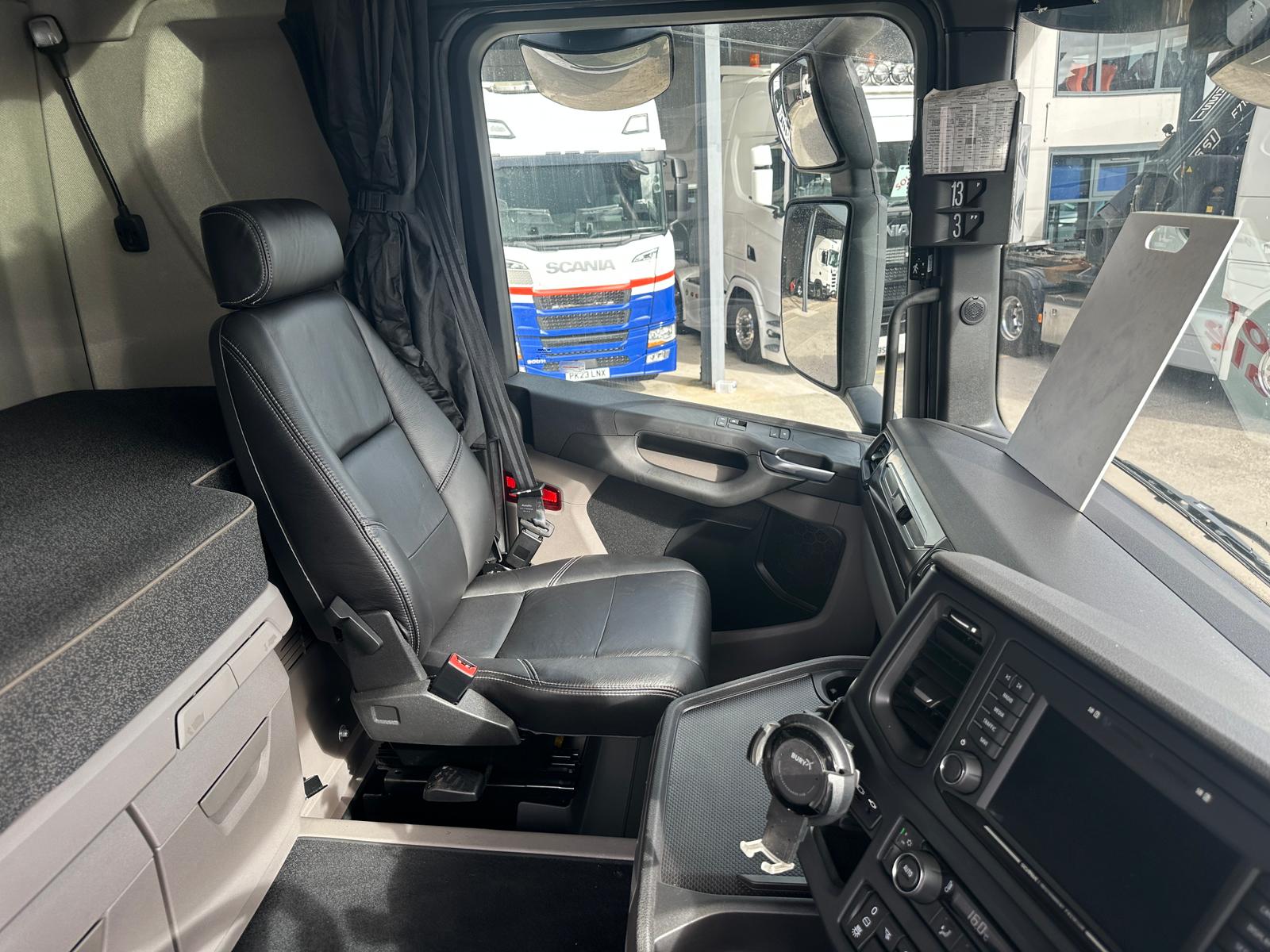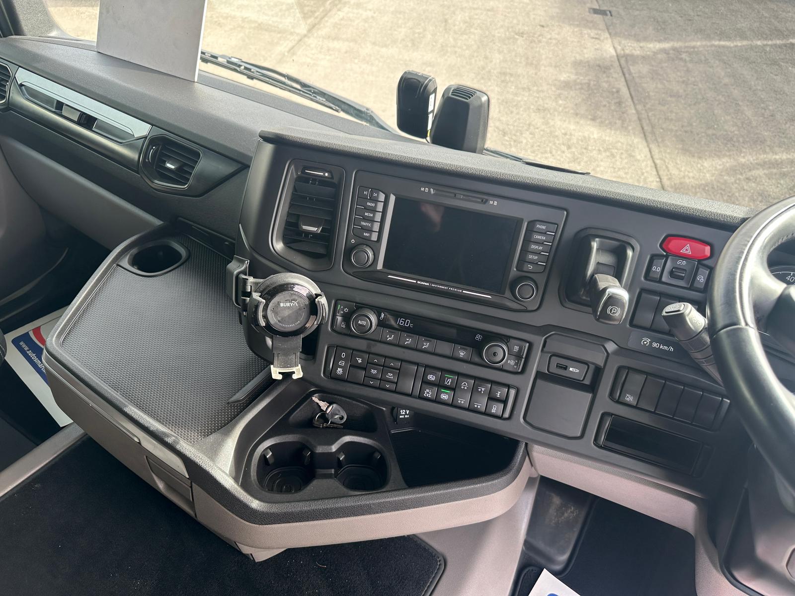 Leather Interior, Scania Premium Infotainment System, Fridge, Side skirts, Sky lights and fog lights, Single Bunk with Rear Lockers, Beacons & Strobes, CB Radio, Phone Holder