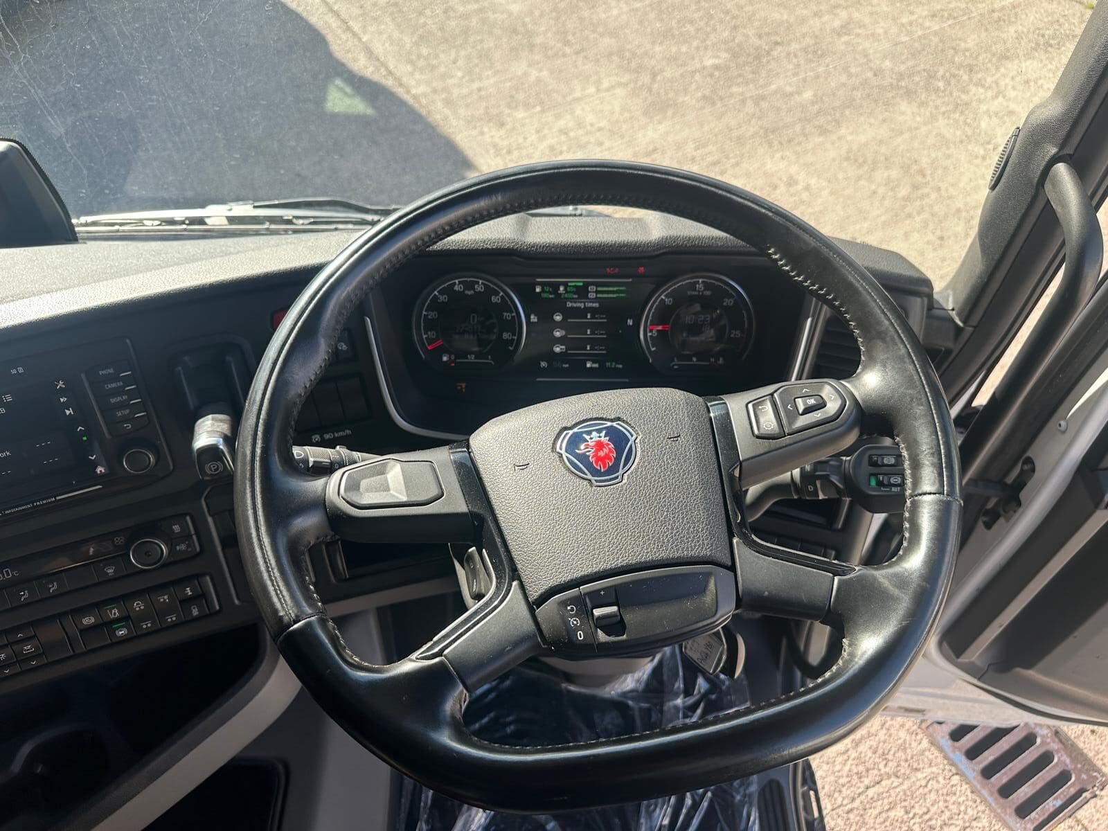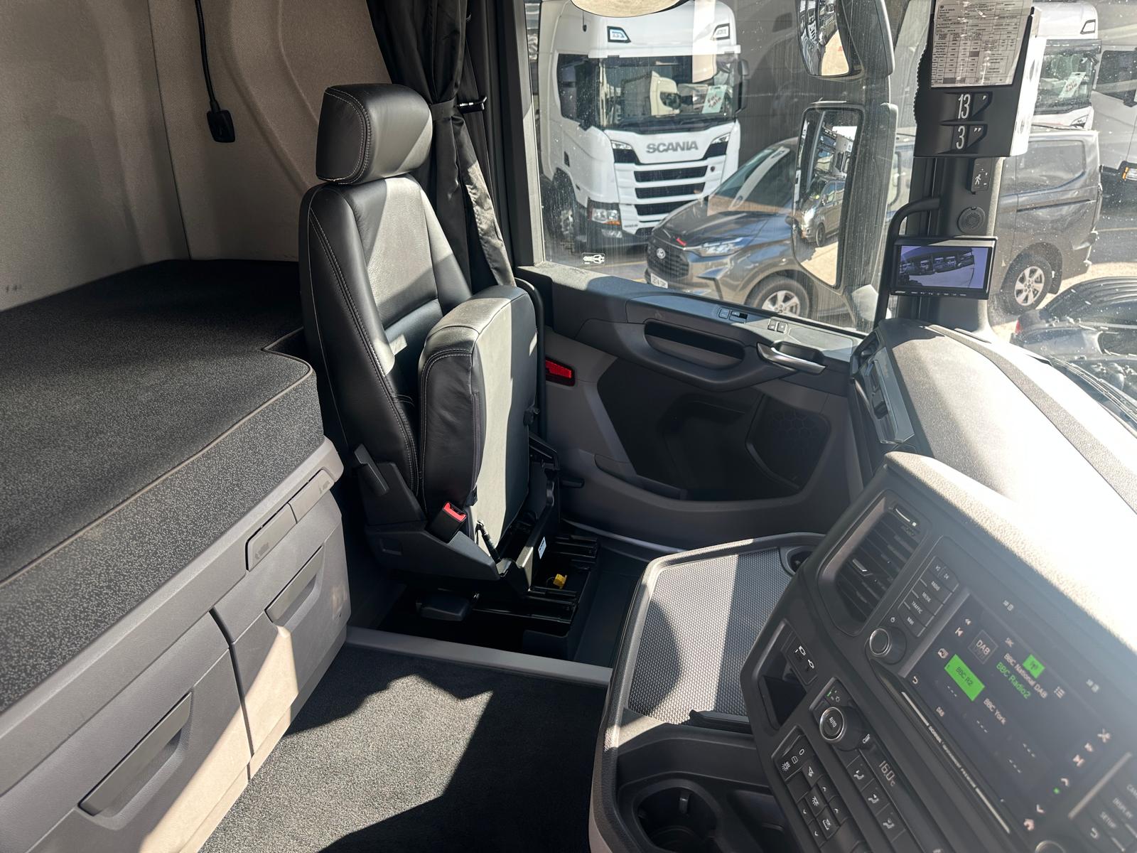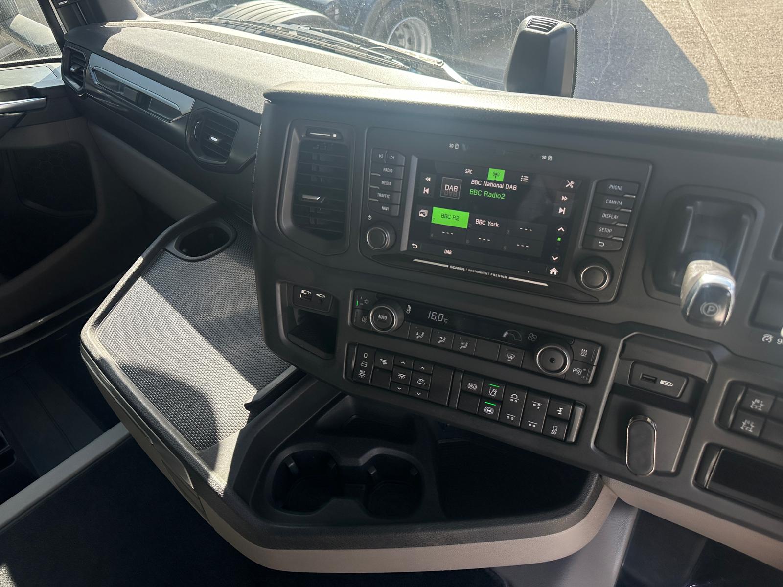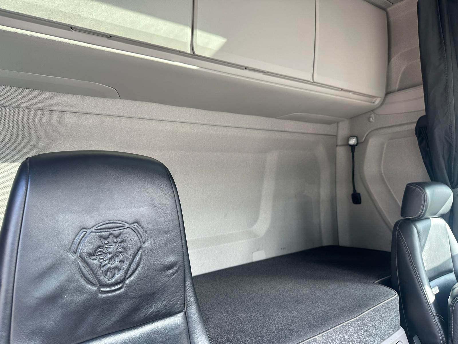 Leather seats, Fridge, Sky lights & Fog lights, Scania Premium Infotainment System, Single Bunk with Rear Lockers, Side Skirts, Dual Hydraulics