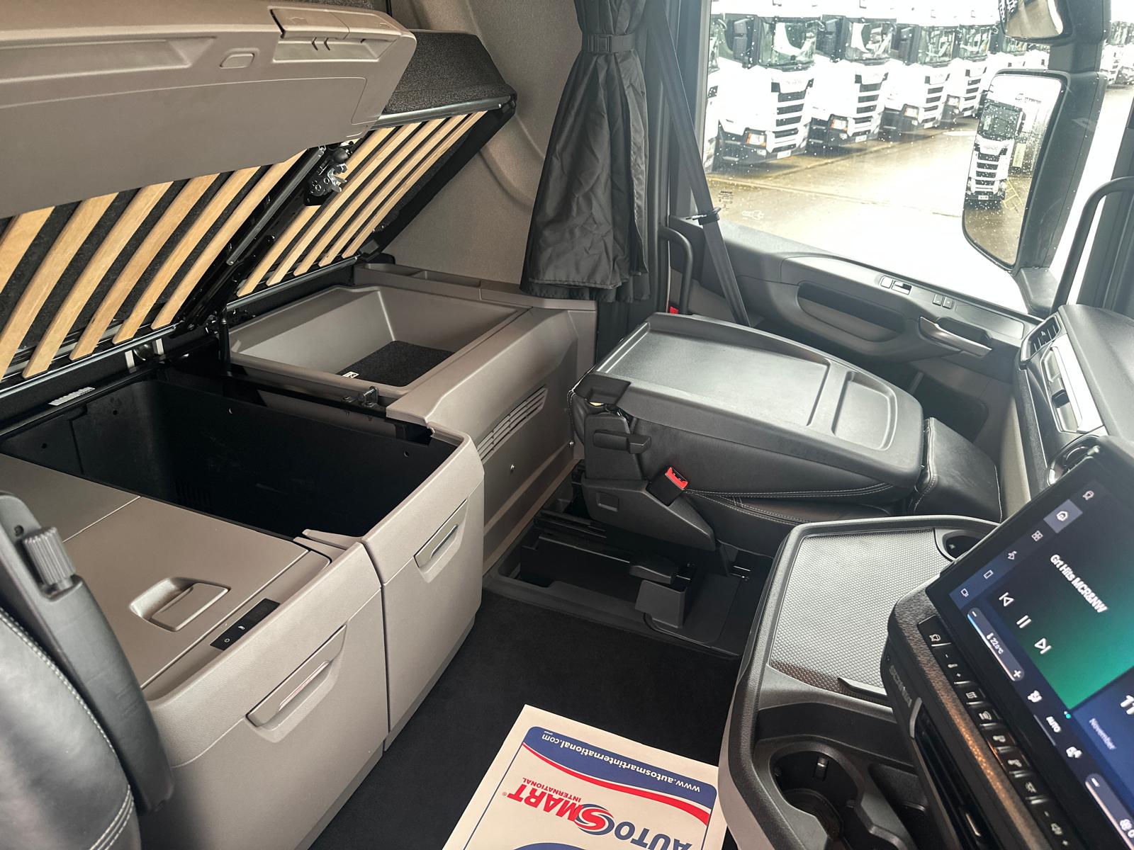 Leather Interior, Scania Premium Infotainment System, Fridge, Side skirts, Sky lights and fog lights, Single Bunk with Rear Lockers, New Dashboard, Walking Floor Hydraulics, Immaculate Condition